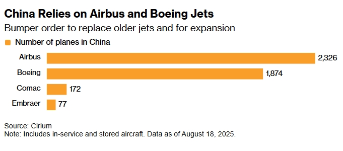 Китай полагается на самолеты Airbus и Boeing. Заказ на лайнеры для замены старых самолетов. Количество самолетов в Китае. Источник: Цириум. Примечание: Включая находящиеся в эксплуатации и на хранении самолёты. Данные по состоянию на 18 августа 2025 года.