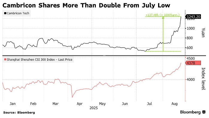 Новости о том, что китайские власти рекомендовали местным компаниям избегать чипов Nvidia H20, улучшили восприятие производителей чипов на фоне растущей геополитической нестабильности и изменений в цепочках поставок. В то же время увеличение числа отечественных моделей искусственного интеллекта, таких как DeepSeek, дополнительно стимулировало спрос на местные полупроводниковые решения. В июле Cambricon объявила о частном размещении акций на 4 млрд юаней (557 млн долларов США) для финансирования своей платформы по производству крупных моделей чипов.