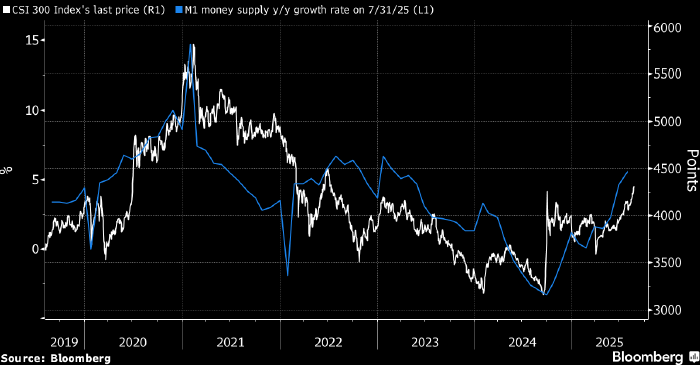 Белым — индекс CSI 300 (правая шкала), голубым — денежная масса M1 в Китае (изменение % г/г, левая шкала). Источник: Bloomberg