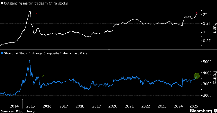 Сверху — маржинальный долг на рынке акций Китая (трлн юаней), внизу — индекс Shanghai Composite. Источник: Bloomberg