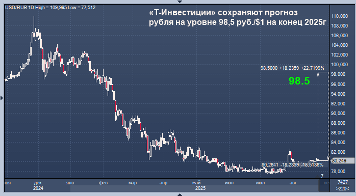 "Т-Инвестиции" сохраняют прогноз по курсу валютной пары доллар/рубль на конец 2025 года на уровне 98,5 руб./$1, говорится в материале главного экономиста брокера Софьи Донец.
