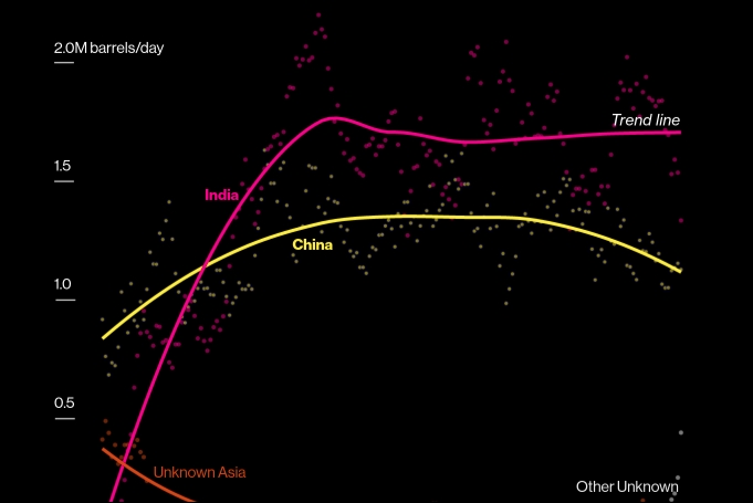 Графики отражают объемы покупок российской нефти Индией и Китаем, перевозимой морским путем. Трендовые линии построены по принципу скользящего среднего значения за 4 недели.