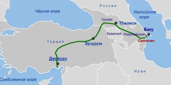 Трубопровод Баку-Тбилиси-Джейхан, протяжённостью 1768 км и управляемый BP (BP.L), транспортирует нефть с каспийских месторождений Азербайджана и Казахстана в турецкий порт Джейхан. Этот маршрут является частью стратегии Казахстана по диверсификации экспорта энергоносителей и снижению зависимости от России. Более 80% нефти, экспортируемой Казахстаном, транспортируется через российский порт на Чёрном море Каспийским трубопроводным консорциумом.