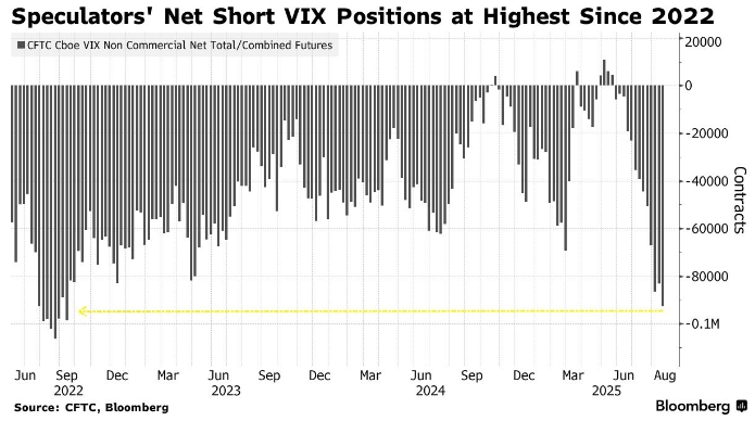 Согласно отчёту Комиссии по торговле товарными фьючерсами, за неделю, завершившуюся 19 августа, хедж-фонды и крупные спекулянты держали чистые короткие позиции по фьючерсам, привязанным к индексу VIX, на уровне около 92 786 контрактов. Последний раз такой показатель фиксировался в сентябре 2022 года.