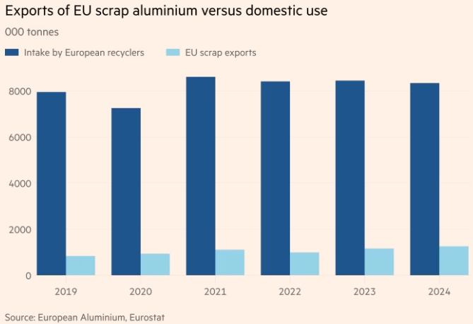 В период с 2019 по 2024 год экспорт алюминиевого лома из ЕС вырос на 53%, тогда как внутреннее потребление увеличилось всего на 5%.