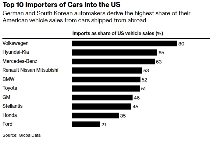 10 крупнейших поставщиков автомобилей в США. Немецкие и южнокорейские автопроизводители получают наибольшую долю продаж своих автомобилей в Америке за счет машин, поставленных из-за рубежа. Источник: GlobalData