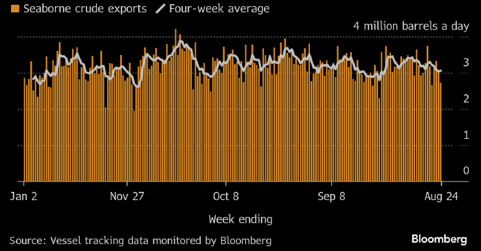 На неделе до 24 августа морской экспорт нефти из РФ сократился на 320 тыс. б/д до четырехнедельного минимума в 2,72 млн б/д, пишет Bloomberg со ссылкой на данные по движению судов. Снижение показателя было обусловлено атаками дронов на балтийский порт Усть-Луга и нефтеперекачивающую станцию в городе Унеча, которая является крупнейшим узлом магистрального нефтепровода «Дружба», пишет агентство.