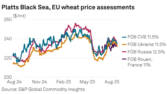 Platts оценил российскую пшеницу 12,5% FOB Черное море в 234,5 долл. США/т 26 августа.