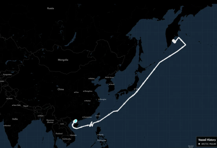 Согласно данным отслеживания судов, Arctic Mulan в начале июня загрузил партию СПГ с плавучего хранилища на востоке России. Топливо в хранилище поступило с завода «Арктик СПГ 2». Прошлым летом «Арктик СПГ 2» произвел восемь партий, но в октябре был вынужден приостановить работу, так как не смог найти покупателей, а вокруг объекта началось сезонное нарастание льда. Вместо этого суда выгружали топливо на хранилища в России.