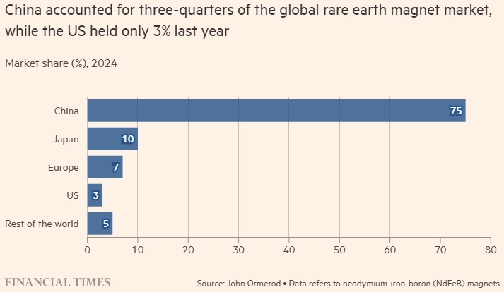 На Китай пришлось три четверти мирового рынка редкоземельных магнитов, тогда как на долю США в прошлом году пришлось всего 3%.. Доля рынка (%), 2024 г. Китай: 75. Япония: 10. Европа: 7. США: 3. Остальной мир: 5. FT. Источник: Джон Ормерод. Данные относятся к магнитам из неодима-железа-бора (NdFeB).