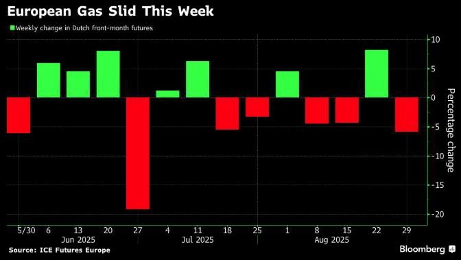 В пятницу цены на газ голландского хаба TTF с поставкой в октябре продолжили падение, потеряв 6,4% за неделю. Судно, перевозившее сжиженный природный газ с российского экспортного терминала «Арктик СПГ-2», покинуло китайский терминал, по всей видимости, выгрузив там часть груза, что усилило слухи об испытании санкций в преддверии визита президента Владимира Путина в Пекин.