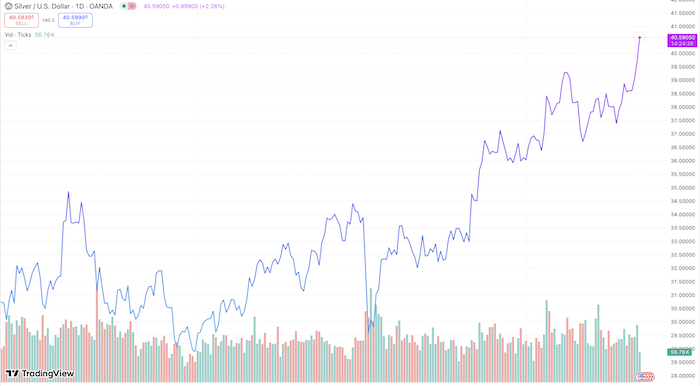 В понедельник спотовое серебро подорожало на 1,4%, достигнув отметки $40,2920 за унцию. С начала этого года его рост составил более 40% на фоне общего ралли вместе с золотом, платиной и палладием. Золото в начале недели выросло на 0,7%, достигнув самого высокого уровня с момента апрельского рекорда.