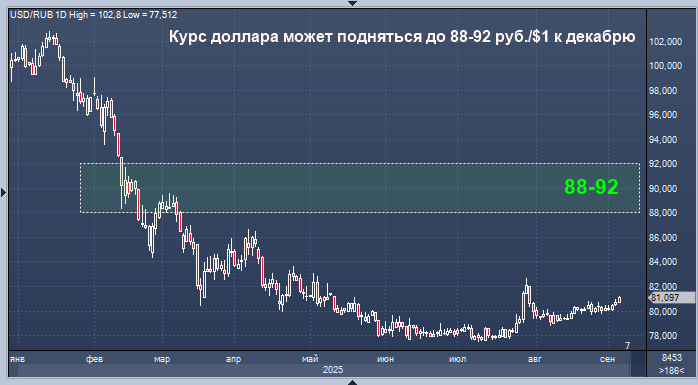 "Курс доллара в сентябре может колебаться в диапазоне 80-83 руб./$1 с потенциалом роста до 88-92 руб./$1 к декабрю при сохранении негативных факторов. Евро может достичь 95 руб./EUR1 в ближайшие дни и вырасти до 100-110 руб./EUR1 к концу года, а юань - до 11,5 руб. уже в текущем месяце с возможным выходом к 12-13 руб. за юань к концу года, - пишет эксперт в комментарии. - Учитывая риски дальнейшего падения нефти и геополитической нестабильности, рекомендуем инвесторам учитывать сценарии ослабления рубля и диверсифицировать активы, включая иностранную валюту и золото".