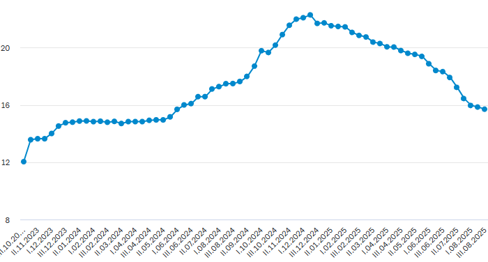 Максимальная процентная ставка в указанных выше кредитных организациях опустилась в третьей декаде августа до 15,70% (см. график выше). Во второй декаде она составляла 15,85%, а в первой — 15,96%.