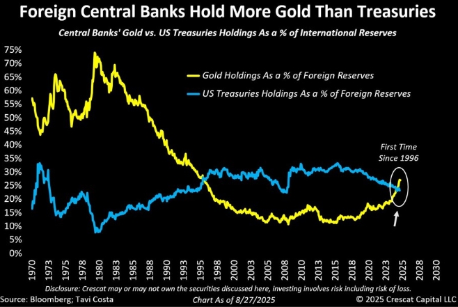 Доля казначейских облигаций в общем объёме резервов центральных банков сокращается. По некоторым данным, она составляет всего 23%, что ниже пиковых значений 2010-х годов, когда она превышала 30%, и ниже текущей доли золота, которая составляет 27%.