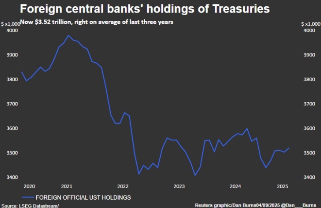 В настоящее время цена на золото превышает 3500 долларов за унцию, увеличившись с начала года на 35%. Золотые резервы центральных банков оцениваются в 4,5 триллиона долларов, что значительно превышает их казначейские облигации, стоимость которых составляет 3,5 триллиона долларов.