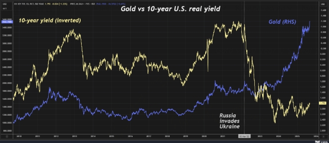 В этом году динамика золота и государственных облигаций существенно разошлась, и это особенно проявилось на этой неделе, когда цена на золото достигла нового максимума, а доходность долгосрочных облигаций достигла уровней, не наблюдавшихся десятилетиями, а в некоторых случаях и вообще никогда.