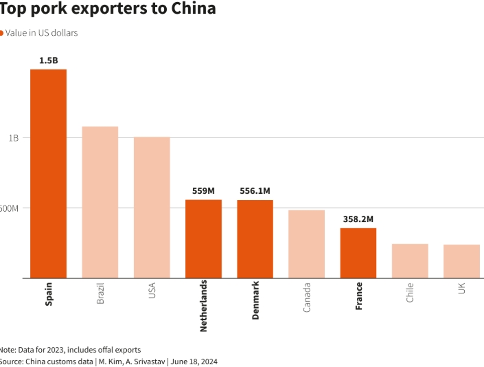 В пятницу Китай ввёл предварительные антидемпинговые пошлины в размере 62,4% на импорт свинины из Евросоюза на сумму свыше 2 миллиардов долларов, что обострило торговый конфликт с блоком, начавшийся из-за пошлин на китайские электромобили.