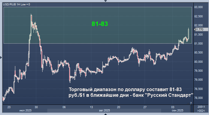 Торговый диапазон по доллару, скорее всего, составит в ближайшие дни 81-83 руб./$1, по евро - 97 руб./EUR1, полагает директор департамента операций на финансовых рынках банка "Русский Стандарт" Максим Тимошенко.