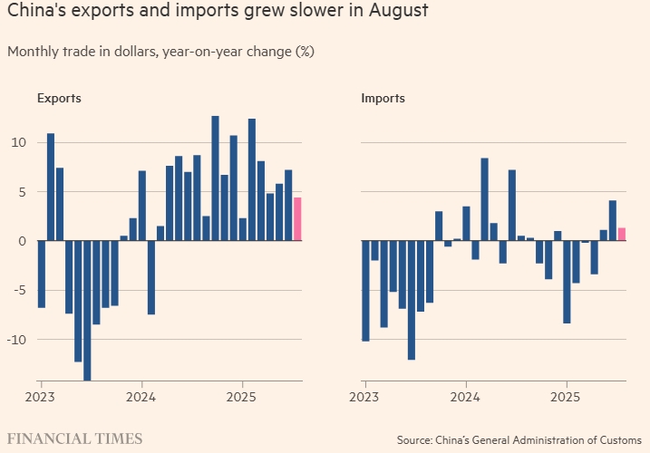 Несмотря на то, что августовский экспорт стал самым низким с начала 2025 года, он всё же способствовал устойчивому росту в течение нескольких месяцев после начала полномасштабной торговой войны с США в апреле. С тех пор были заключены несколько соглашений о перемирии, временно снизивших заоблачные тарифы, но долгосрочное торговое соглашение между двумя крупнейшими экономиками мира пока не достигнуто.