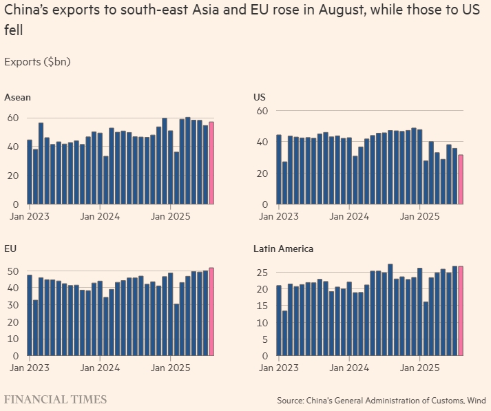 Экспорт Китая в США в августе снизился на 33 %, продолжив тенденцию к падению, начавшуюся в последние месяцы. Однако экспорт в другие регионы, такие как Юго-Восточная Азия, вырос, что привлекло внимание к возможному изменению маршрутов поставок. Экспорт в Юго-Восточную Азию увеличился на 22,5 % в августе, а в ЕС — на 10 %.