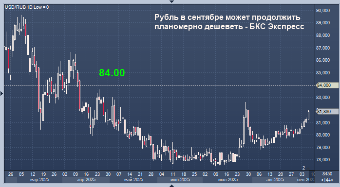 Рубль в сентябре может продолжить планомерно дешеветь, полагает эксперт БКС Экспресс Дмитрий Бабин.