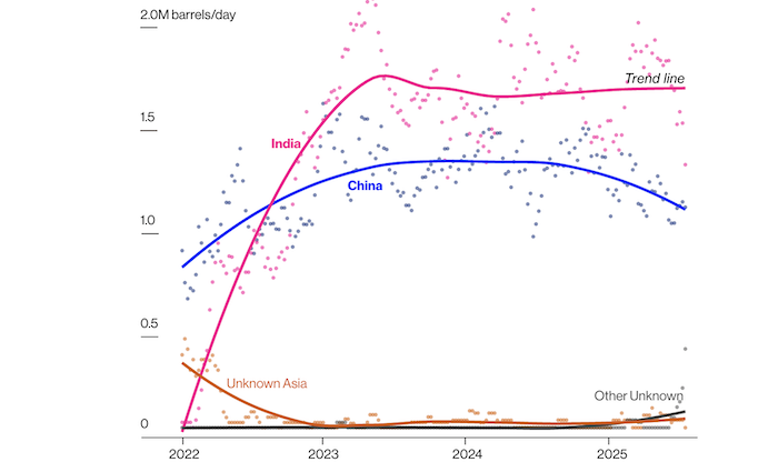 Индия остается крупнейшим покупателем российской нефти. Источник: Bloomberg