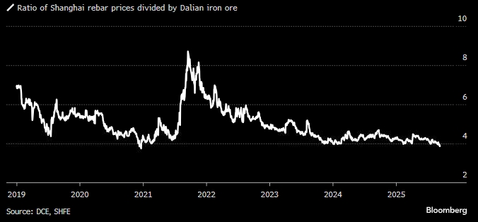По данным Bloomberg, соотношение фьючерсов на стальную арматуру в Шанхае и контрактов на железную руду в Даляне на этой неделе упало до самого низкого уровня с 2020 года, что свидетельствует о низкой марже металлургических комбинатов. Это соотношение является важным индикатором рынка стали.