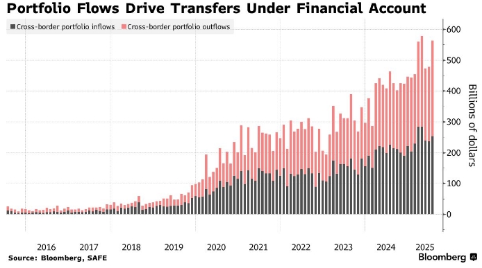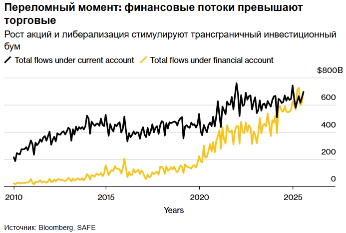 Резкий рост фондового рынка способствовал увеличению двусторонних финансовых потоков до рекордных 4,5 триллиона долларов за первые семь месяцев года. Это произошло не только благодаря акциям, но и благодаря активной торговле краткосрочными облигациями китайских банков и покупке иностранцами государственных облигаций.