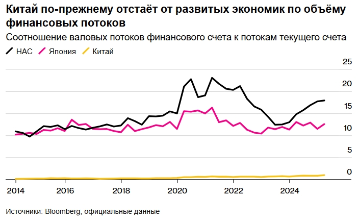 Согласно данным Bloomberg, основанным на официальной статистике за июль, переводы по финансовому счёту Китая увеличиваются в среднем на 17% в месяц по сравнению с прошлым годом. Если этот тренд сохранится, они могут впервые превысить объёмы переводов по текущему счёту или для международной торговли.