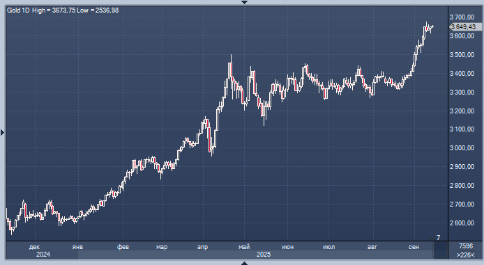 На момент 06:09 по Гринвичу спотовые цены на золото увеличились на 0,5% и достигли $3651,92 за унцию. Цена декабрьских фьючерсов на золото выросла на 0,5% до $3690,30, а цена контрактов колебалась около рекордного уровня в $3673,95, зафиксированного во вторник. С начала недели стоимость золотых слитков увеличилась на 1,8%.