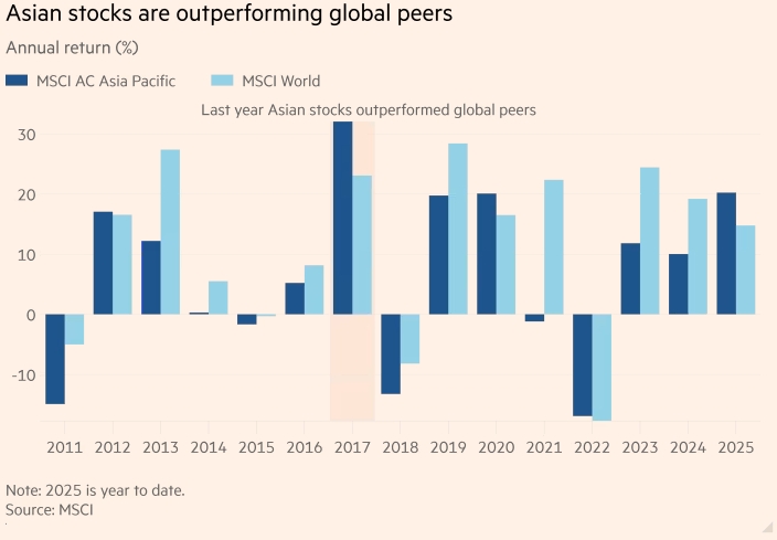 Азиатские акции превосходят мировые аналоги. Годовая доходность (%). MSCI AC Азиатско-Тихоокеанский регион. MSCI Мир. В прошлом году азиатские акции превзошли мировые аналоги. Примечание: 2025 год — по текущее время. Источник: MSCI