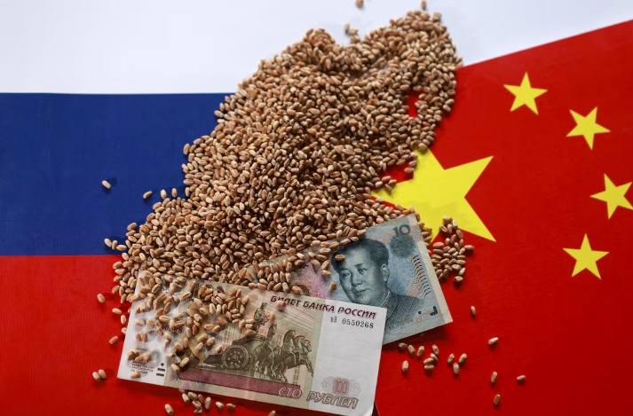 На этой иллюстрации, сделанной 14 сентября 2025 г., изображены российские и китайские флаги, пшеничные зёрна, юани и рубли. REUTERS/Dado Ruvic