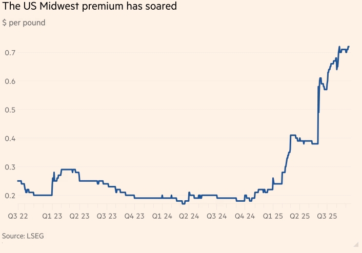 В текущем году цены на алюминий на региональных рынках США значительно возросли после того, как Трамп ввёл 50-процентный сбор на импорт металла, который используется в автомобильной и упаковочной промышленности. В результате премия Среднего Запада, которая представляет собой надбавку к лондонской цене за доставку в США, увеличилась на 177%, достигнув рекордного уровня более 70 центов за фунт.