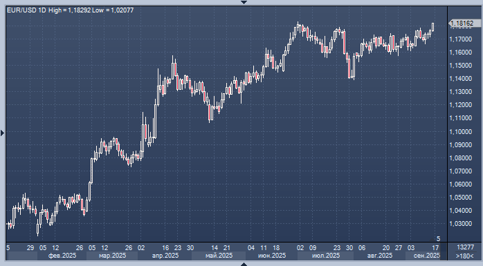 Евро вырос на 0,3% по отношению к ослабившемуся доллару, достигнув отметки $1,1797 — уровня, не наблюдавшегося с 3 июля.