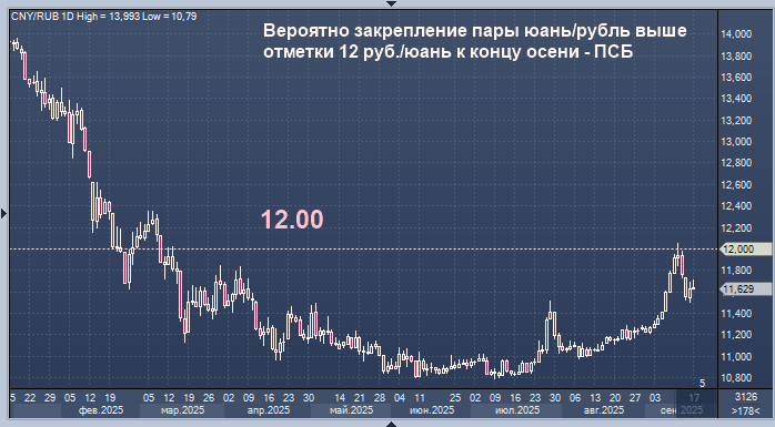 Вероятно закрепление юаня выше отметки 12 руб./юань к концу осени, прогнозирует управляющий по анализу банковского и финансового рынков банка ПСБ Богдан Зварич. Во вторник юань смог отыграть часть потерь, понесенных в последние сессии. По итогам дня китайская валюта поднялась на 0,5%, закончив торги чуть выше 11,6 рубля, отмечает эксперт.