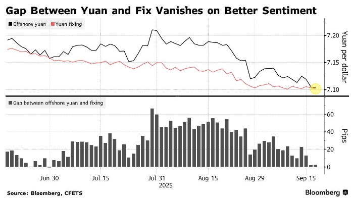 Офшорный юань, более чувствительный к рыночным настроениям и меньше подверженный контролю властей, временно укрепился после фиксации в среду. В этом месяце он был сильнее своего национального аналога практически каждый день, что отражает различия в показателях августа и июля.