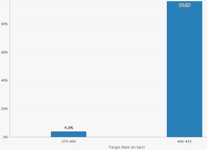 Рынок фьючерсов на ставку по федеральным фондам закладывается на ее снижение на сегодняшнем заседании FOMC (первое в этом году). Вероятность снижения на 25 б.п. до 4,00%-4,25% оценивается в 96%, а вероятность снижения на 50 б.п. до 3,75%-4,00% — в 4%, следует из данных CME (см. график ниже).