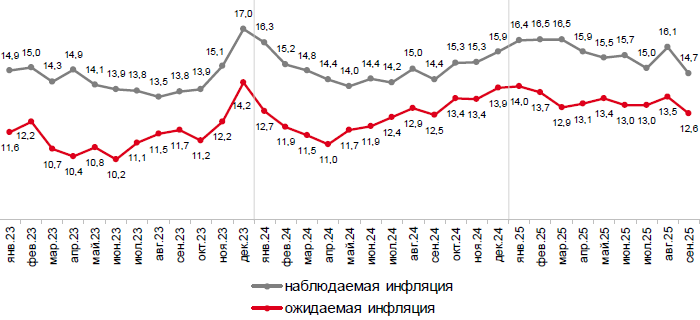 В сентябре инфляционные ожидания россиян снизились до 12,6%, что является самым низким уровнем с сентяря 2024 года. Одновременно с этим наблюдаемая инфляция опустилась до 14,7% — также минимальное значение с сентября 2024 года.