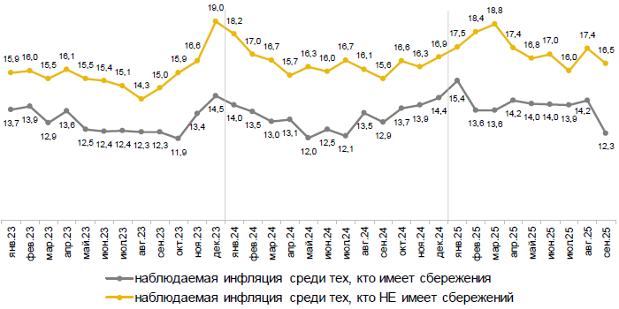 В группах респондентов, которые имеют и не имеют сбережений, также отмечено снижение наблюдаемой инфляции: до 12,3% (минимум с июля 2024 г.) и 16,5% соответственно (здесь отмечено резкое увеличение разрыва между ожиданиями этих двух групп).