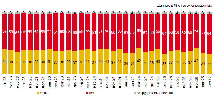 Доля участников опроса, которые не имеют финансовой «подушки» безопасности выросла до 64%. Это — рекордное значение как минимум с января 2023 года.