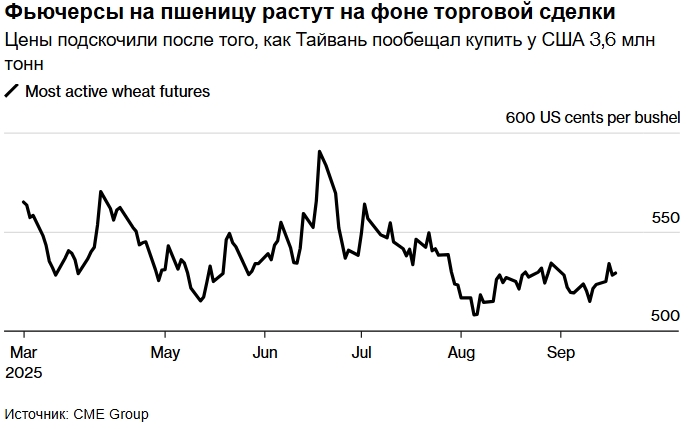 Фьючерсы на американскую пшеницу поднялись после падения, произошедшего на предыдущей сессии. Причиной стало подписание соглашения между тайваньской группой и США. В рамках этого документа тайваньская сторона обязалась приобрести 3,6 млн тонн зерна у американского производителя в течение следующих трёх лет.