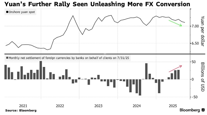 Аналитики полагают, что юань приближается к ключевым уровням, что может стимулировать местные компании к конвертации своих долларовых активов. В последние недели наблюдался рост продаж долларов, а данные за июль показали, что спрос на обмен иностранной валюты на юани превышал предложение. Если курс юаня достигнет 7,0–7,1 за доллар (текущий уровень — 7,11), компании могут активизировать конвертацию, что, по оценкам Barclays Bank Plc. и Dongwu Securities, может привести к продаже до 300 миллиардов долларов из валютных резервов.