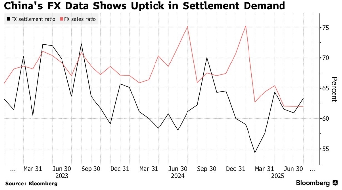 В июле соотношение конвертации иностранной валюты в юани к трансграничным поступлениям превысило аналогичный показатель по покупкам иностранной валюты, впервые с сентября 2024 года. В конце августа и начале сентября экспортёры активизировали продажи долларов, но затем объёмы снизились, а на этой неделе снова возросли, по словам трейдеров.
