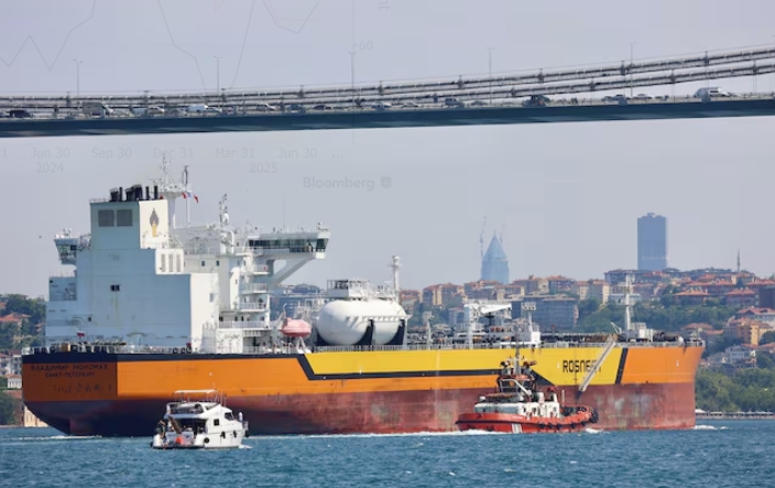 Нефтяной танкер «Владимир Мономах» под российским флагом компании «Роснефть» проходит через Босфор в Стамбуле, Турция, 6 июля 2023 года. REUTERS/Yoruk Isik