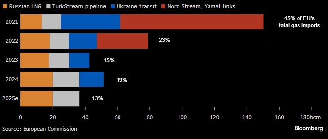 Поставки российского газа в Европу резко сократились после 2022 года, но поставки по трубопроводу через Турцию и поставки сжиженного природного газа по-прежнему составляли почти 19% от общего объема импорта ЕС в 2024 году.