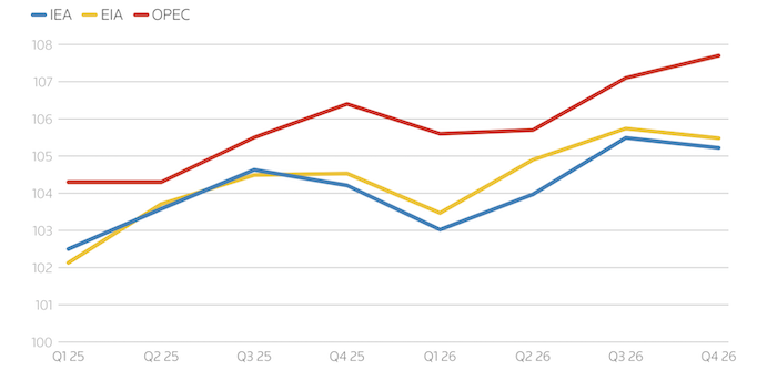 Прогнозы по спросу от ведущих агентств сильно разнятся. Международное энергетическое агентство (МЭА) ожидает рост потребления на 740 000 баррелей в сутки в 2025 году, в то время как ОПЕК прогнозирует рост на 1,3 млн баррелей в сутки. Это огромная, одна из самых больших за всю историю, разница в оценках.