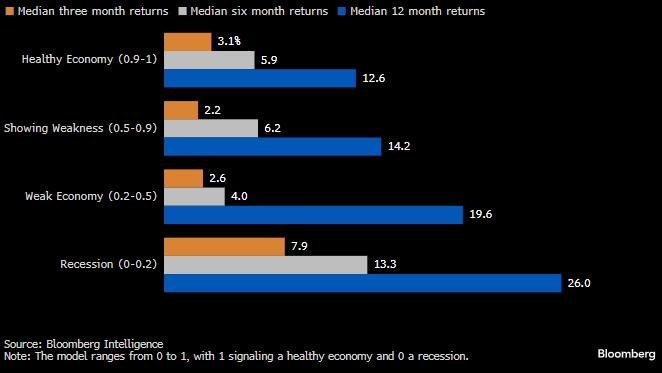 По мнению аналитиков Bloomberg Intelligence, ключевым фактором является то, сможет ли экономика избежать режима среднего роста, который совпал со сравнительно слабым ростом акций. Модель BI показывает, что периоды, когда усиливаются опасения по поводу экономического роста — например, в мае прошлого года, — как правило, являются идеальными для покупки акций, в то время как рынок также демонстрирует хорошие результаты, когда экономика сильна.