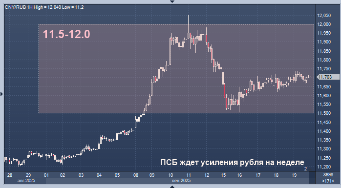 Рубль, вероятно, продемонстрирует попытки восстановления на текущей неделе, что будет способствовать отступлению курса валютной пары юань/рубль к нижней границе диапазона 11,5-12 рублей за юань, считает управляющий по анализу банковского и финансового рынков банка ПСБ Богдан Зварич.