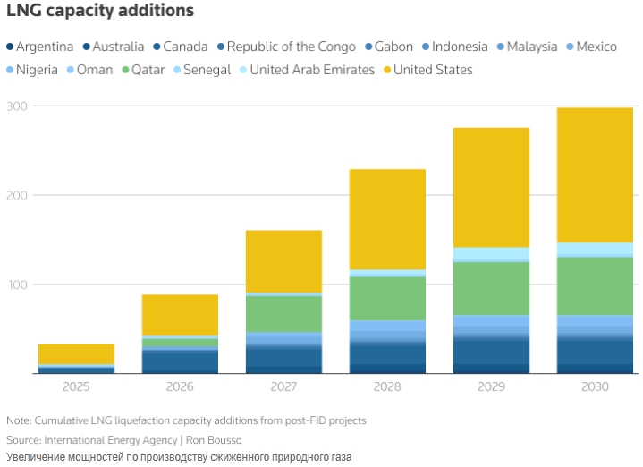 По данным LSEG, к концу этого десятилетия мировые мощности по производству СПГ вырастут на впечатляющие 60%, увеличившись с 550 млрд кубометров в 2024 году до 890 млрд кубометров в 2030 году. При этом ожидается, что половина этого прироста придется на США. Однако спрос вряд ли сможет соответствовать таким темпам роста. Хотя в этом году спрос и предложение находятся в относительном равновесии, прогнозы LSEG указывают на появление избытка предложения на рынке уже в 2026 году — около 50 млрд кубометров, а к 2030 году этот разрыв может достичь 200 млрд кубометров.